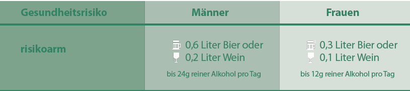 Bewusster Umgang mit Alkohol: Alkohol bewusst zu geniessen bedeutet, achtsam zu trinken – mit Freude, aber ohne Übermass. Kleine Mengen gelten als risikoarm, sind jedoch nicht risikofrei und können bei regelmässigem Konsum der Gesundheit schaden. Die sicherste Wahl ist, keinen Alkohol zu trinken. Häufiger und hoher Konsum gefährdet die Gesundheit und kann schwere Folgen haben. Selbst wer viel trinkt, ohne betrunken zu wirken, schadet seinem Körper. Mindestens zwei alkoholfreie Tage pro Woche schonen den Organismus.