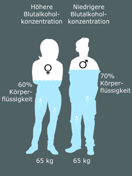 Unterschiede zwischen Männer und Frauen: Dieselbe Menge Alkohol erreicht bei Frauen eine höhere Konzentration im Blut als bei Männern, weshalb Frauen sensibler auf Alkohol reagieren.